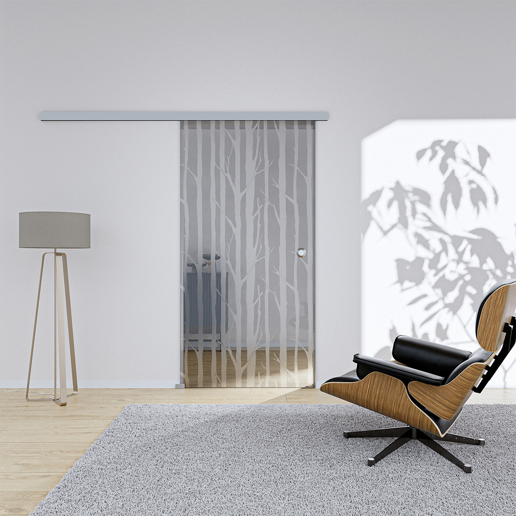Die Glasschiebetür Timber2 Komplettset verbindet eine strukturierte, natürliche Optik mit präzise abgestimmter Technik. Das Timber2-Dekor zeigt vertikal verlaufende Baumformen, die sich klar und gleichmäßig über die Glasfläche ziehen und eine ruhige, geordnete Raumwirkung erzeugen.