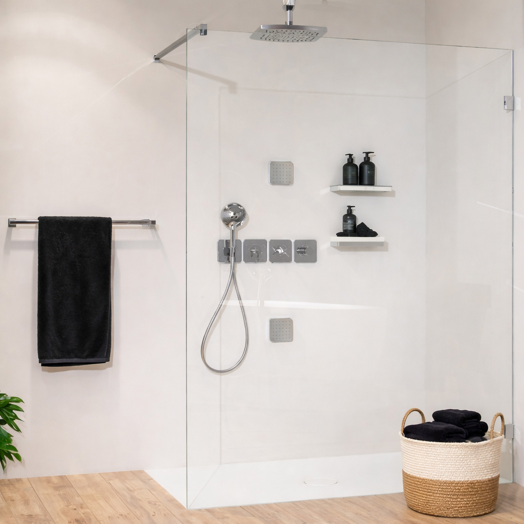 Unsere Walk-In Glasdusche ist bewusst so konzipiert, dass sie sich unkompliziert planen und montieren lässt. Durch die klar definierten Breitenmaße in 100-mm-Schritten entfällt das aufwendige Aufmaß einer klassischen Duschtür.